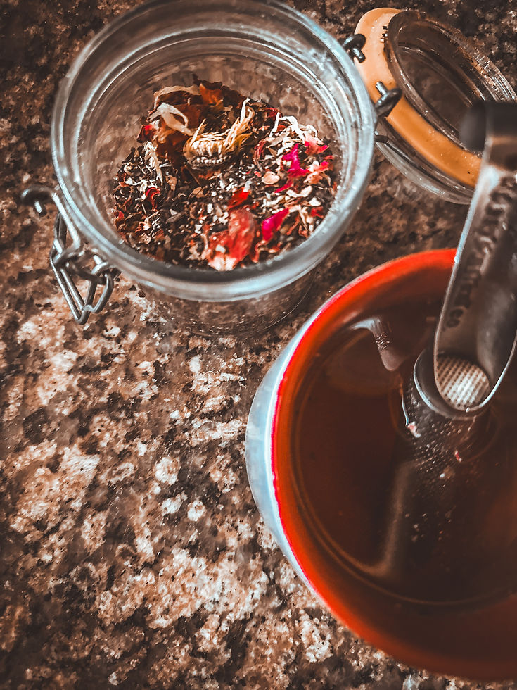 Today, I’m sipping on our Cowboy Tea, a rich and smoky brew with notes of roasted yerba maté, cacao, orange peel, cinnamon, and rose. I like mine with a drizzle of honey and a splash of almond milk — the perfect cup for this odd, rainy weather we’re having.
